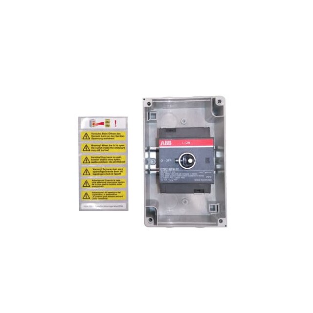 ABB Enclosed Solar DC Switch 660V/32A Manufacturers Part Number OTDCP32SA22M BayWa r.e. Part Number IS10240 Available for ✅ Consumer-Account ✅ Trade-Account $23.00 (excl. GST) WarehouseQty AvailableQty RestockBayWa WA Perth162BayWa QLD Yatala4 -+ Backorder Product description Technical details Product Images BackProduct DescriptionThe enclosure in the OTDCP series is using a rigid glass reinforced polycarbonate enclosure. The enclosure is UV protected, protected against low-pressure water jets (IP65), and hence built for outdoor and indoor use. The cable entries are threaded and have knock out holes for 2 parallell cables, both from top and bottom. The handle is padlockable and made for three padlocks. The cover is interlocked, and the interlock can be defeated with a special tool. Typical applications is solar panels, DC batteries, etc.Back Dimensions 12.8 x 9.5 x 15.5 cm Weight 0.63kg Back Download Information ABB Encolsed Switch Disconnectors