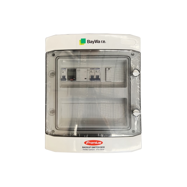Primo GEN24 Backup Box | 1 Phase 6-10kW 24 Way Manufacturers Part Number Backup-1p-6-10-24way BayWa r.e. Part Number IN552200 Available for ✅ Consumer-Account ✅ Trade-Account $1,049.00 (excl. GST) WarehouseQty AvailableQty RestockBayWa WA Perth0 -+ Backorder Product description Technical details Product Images BackProduct DescriptionAutomatic backup/switchbox (single phase) to suit Fronius GEN24 Primo inverters up to 10kW. Backup box comes fully assembled with smart meter, contactors, relays, and terminals in 24 Way Enclosure.Back Dimensions 31.9 x 25.9 x 14.4 cm Weight 3.2kg Back DocumentsInstallation guide