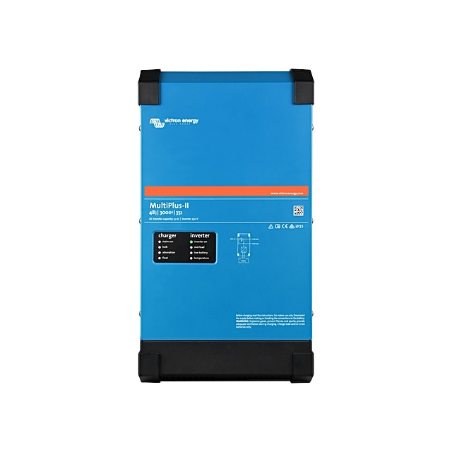 Victron MultiPlus-II 48/3000/35-32 230V Manufacturers Part Number PMP482305012 BayWa r.e. Part Number IN802333 Available for ❌ Consumer-Account ✅ Trade-Account $902.70 (excl. GST) WarehouseQty AvailableQty RestockBayWa WA Perth1 -+ Product description Technical details Product Images BackProduct DescriptionThe MultiPlus-II combines the functions of the MultiPlus and the MultiGrid.It has all the features of the MultiPlus, plus an external current transformer option to implement PowerControl and PowerAssist and to optimize self-consumption with external current sensing (max. 32A).It also has all the features of the MultiGrid with built-in anti-islanding and an increasingly long list of country approvals.Note: for a short period of time this product was called MultiGrid-II.Back Watt 2,400 Display No DC connection unknown Dimensions 14.7 x 26.8 x 49.9 cm Weight 19.0kg Product warranty 5 years Extensions for 5 years CEC Certification Clean Energy Council - Approved InvertersBack DocumentsDatasheetInstallation guideDownload Information Introduction: MultiPlus-II