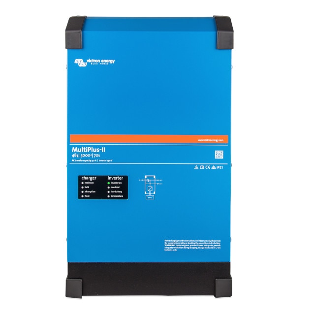 Victron Multiplus-II 48V/5000VA 70/50 Manufacturers Part Number PMP482505010 BayWa r.e. Part Number IN802355 Available for ❌ Consumer-Account ✅ Trade-Account $1,285.20 (excl. GST) WarehouseQty AvailableQty RestockBayWa WA Perth3 -+ Product description Technical details Product Images BackProduct DescriptionThe MultiPlus-II combines the functions of the MultiPlus and the MultiGrid. It has all the features of the MultiPlus, plus an external current transformer option to implement PowerControl and PowerAssist and to optimize self-consumption with external current sensing (max. 32A). It also has all the features of the MultiGrid with built-in anti-islanding and an increasingly long list of country approvals.Back Watt 4,000 Display No DC connection Yes Dimensions 14.9 x 32 x 56.5 cm Weight 30.0kg Product warranty years Extensions for 5 years CEC Certification Clean Energy Council - Approved InvertersBack DocumentsDatasheetInstallation guideDownload Information Introduction: MultiPlus-II